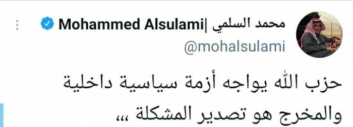 وكشف في تغريدة على حسابه بموقع التدوين المصغر تويتر، اليوم أن: "حزب الله يواجه أزمة سياسية داخلية والمخرج هو تصدير المشكلة".