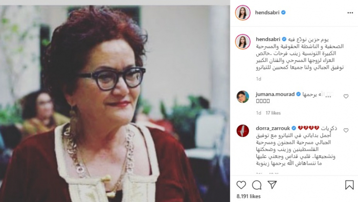 ونشرت هند صبري صورة الراحلة زينب، عبر حسابها الرسمي بموقع "إنستجرام"، علقت :" يوم حزين نودّع فيه الصحفية و الناشطة الحقوقية والمسرحية الكبيرة التونسية زينب فرحات .. خالص العزاء لزوجها المسرحي والفنان الكبير توفيق الجبالي ولنا جميعا كمحبين للتياترو".