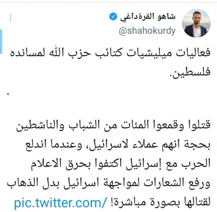 قال الكاتب الصحفي شاهو قرة داغي، أن مليشيات إيران في العراق تقتل وتقمع باسم القدس، وحينما اندلع الصراع اكتفت بحرق الأعلام.