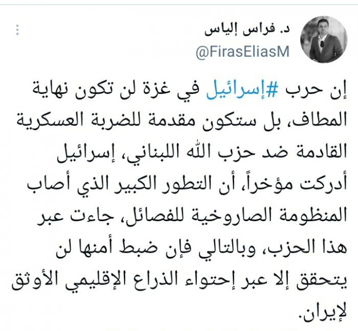 وأوضح أن: "إسرائيل أدركت مؤخرا، أن التطور الكبير الذي أصاب المنظومة الصاروخية للفصائل، جاء عبر هذا الحزب، وبالتالي فإن ضبط أمنها لن يتحقق إلا عبر إحتواء الذراع الإقليمية الأوثق لإيران".