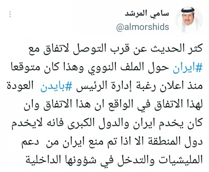 وأكد في تغريدة على حسابه بموقع التدوين المصغر تويتر، اليوم أنه: "كثر الحديث عن قرب التوصل لاتفاق مع إيران حول الملف النووي، وهذا كان متوقعا منذ إعلان رغبة إدارة الرئيس بايدن العودة لهذا الاتفاق".