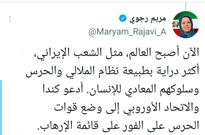 وأضافت: "الآن أصبح العالم، مثل الشعب الإيراني، أكثر دراية بطبيعة نظام الملالي والحرس وسلوكهم المعادي للإنسان".