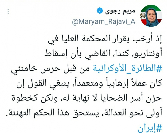 وقالت في تغريدة على حسابها بموقع التدوين المصغر تويتر، اليوم: "إذ أرحّب بقرار المحكمة العليا في أونتاريو، كندا، القاضي بأن إسقاط الطائرة الأوكرانية من قبل حرس خامنئي كان عملاً إرهابياً ومتعمداً، ينبغي القول إن حزن أسر الضحايا لا نهاية له، ولكن كخطوة أولى نحو العدالة، يستحق هذا الحكم التهنئة".