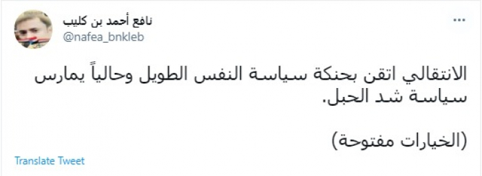 وقال في تغريدة عبر "تويتر" رصدها "المشهد العربي": "الانتقالي اتقن بحنكة سياسة النفس الطويل وحاليًا يمارس سياسة شد الحبل".