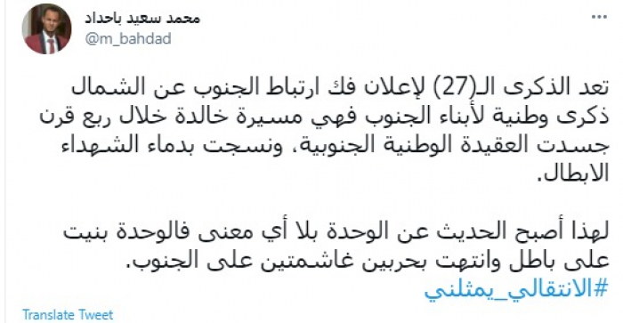 وقال في تغريدة عبر "تويتر" رصدها "المشهد العربي": "تعد الذكرى الـ(27) لإعلان فك ارتباط الجنوب عن اليمن ذكرى وطنية لأبناء الجنوب فهي مسيرة خالدة خلال ربع قرن جسدت العقيدة الوطنية الجنوبية، ونسجت بدماء الشهداء الأبطال".