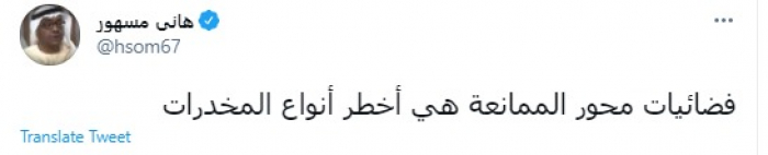 وقال في تغريدة عبر "تويتر" رصدها "المشهد العربي": "فضائيات محور الممانعة هي أخطر أنواع المخدرات".