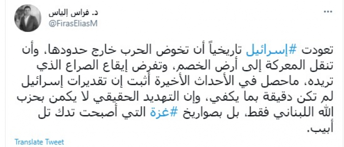 وكتب في تغريدة عبر "تويتر" رصدها "المشهد العربي": "تعودت إسرائيل تاريخياً أن تخوض الحرب خارج حدودها، وأن تنقل المعركة إلى أرض الخصم، وتفرض إيقاع الصراع الذي تريده، ماحصل في الأحداث الأخيرة أثبت إن تقديرات إسرائيل لم تكن دقيقة بما يكفي، وإن التهديد الحقيقي لا يكمن بحزب الله اللبناني فقط، بل بصواريخ غزة التي أصبحت تدك تل أبيب".