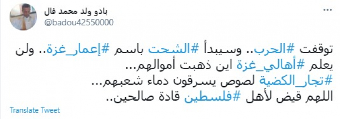 حذر الكاتب الصحفي الموريتاني بادو ولد محمد فال، اليوم، من استغلال تجار القضية الفلسطينية لأحداث غزة الأخيرة تحت ذريعة إعادة إعمار غزة بهدف جمع الأموال والمتاجرة بها وفقًا لأجنداتهم.