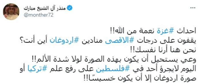 قال المدون السعودي البارز منذر آل الشيخ مبارك، اليوم، إن أحداث غزة الأخيرة كشفت حقيقة متاجرة الرئيس التركي رجب طيب أردوغان بالقضية الفلسطينية.