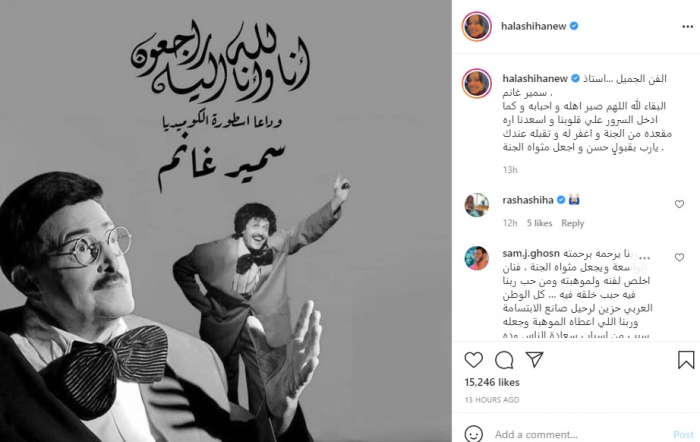 وكتبت "حلا"، عبر حسابها بموقع "إنستجرام": "الفن الجميل، أستاذ سمير غانم، البقاء لله اللهم صبر أهله وأحبابه وكما أدخل السرور على قلوبنا وأسعدنا وأره مقعده من الجنة وأغفر له وتقبله عندك يارب بقبولٍ حسن وأجعل مثواه الجنة".