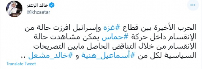 وكتب في تغريدة عبر "تويتر" رصدها "المشهد العربي": "الحرب الأخيرة بين قطاع غزة وإسرائيل أفرزت حالة من الإنقسام داخل حركة حماس يمكن مشاهدت حالة الإنقسام من خلال التناقض الحاصل مابين التصريحات السياسية لكل من إسماعيل هنية وخالد مشعل".