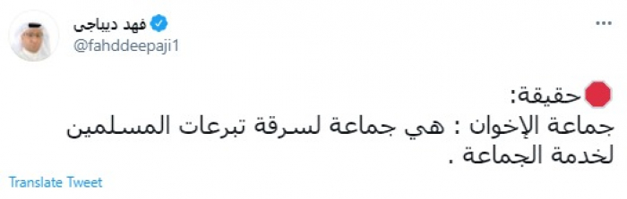 وقال في تغريدة عبر "تويتر" رصدها "المشهد العربي": "حقيقة: جماعة الإخوان.. هي جماعة لسرقة تبرعات المسلمين لخدمة الجماعة".