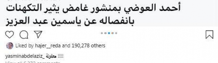 وكان "العوضي" كتب عبر حسابه بـ"فيسبوك": "إنك تنسحب من حياة ناس مش مقدرينك دي مش ندالة أو قلة أصل لا دي منتهى القوة والجدعنة مع نفسك"، مما فتح المجال للعديد من التكهنات حول علاقته بياسمين عبدالعزيز.