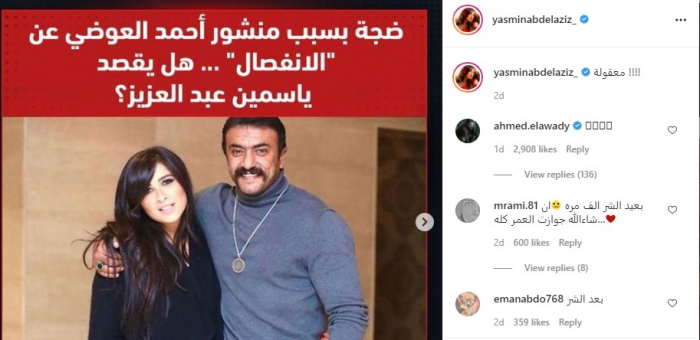 سخرت الفنانة ياسمين عبدالعزيز من تداول العديد من الأخبار التي تفيد بانفصالها عن الفنان أحمد العوضي، بعد منشور الأخير الغامض الذي تحدث خلاله عن الانسحاب من حياة بعض الأشخاص.