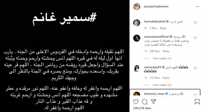 ونشرت إيمي، بوستر الدعاء، عبر حسابها على إنستجرام، وجاء فيه:"سمير غانم..اللهم تقبله وأرحمه وأدخله في الفردوس الاعلى من الجنة.. يا رب إنها أول ليلة له في قبره .. اللهم أنس وحشته، وأرحم وحدته وثبته عند السؤال، وأجعل قبره روضة من رياض الجنة..اللهم قر عينه بقربك، وأسعده بجوارك، ومتع بصره في الجنة بالنظر الى وجهك الكريم ".