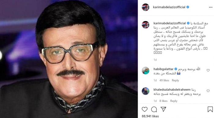 ونشر كريم، صورة سمير غانم، عبر حسابه على إنستجرام، وعلق: "مع السلامة يا أستاذ الكوميديا في العالم العربي.. ربنا يرحمك ويسكنك فسيح جناته.. سنظل طول ما إحنا عايشين فاكرينك ولا يمكن لأي شخص مصري أو عربي ينسى اللي عاش عُمر بحاله يفرح الناس ويبسطهم بأرقى أنواع الفنون.. وداعا يا سمورة".