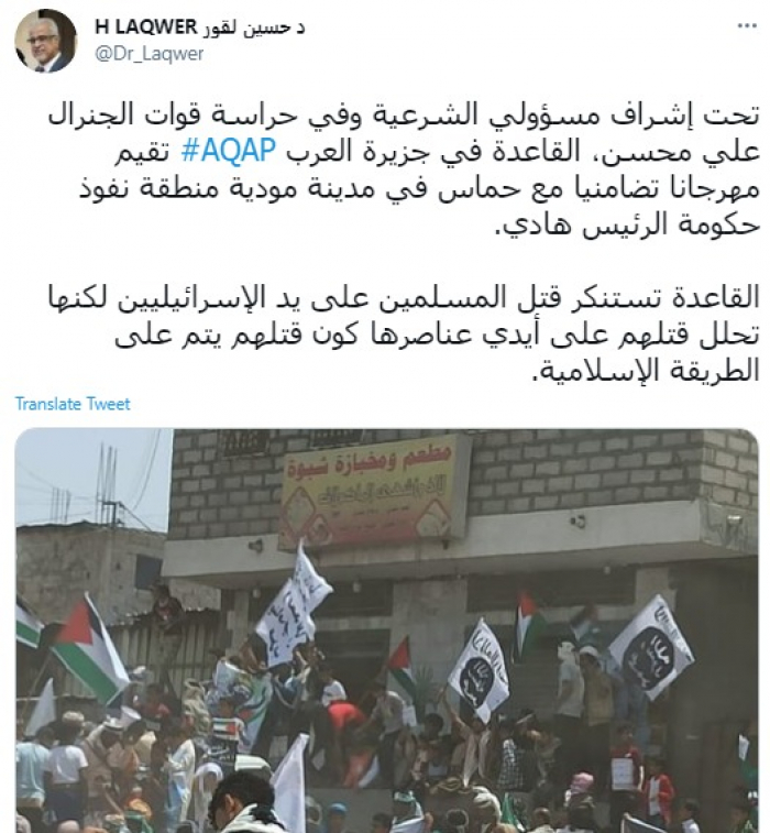 وقال في تغريدة عبر "تويتر" رصدها "المشهد العربي": "تحت إشراف مسؤولي الشرعية وفي حراسة قوات الجنرال علي محسن، القاعدة في جزيرة العرب AQAP تقيم مهرجانا تضامنيا مع حماس في مدينة مودية منطقة نفوذ حكومة الرئيس هادي".