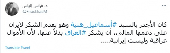 وقال في تغريدة عبر "تويتر" رصدها "المشهد العربي": "كان الأجدر بالسيد إسماعيل هنية وهو يقدم الشكر لإيران على دعمها المالي، أن يشكر العراق بدلاً عنها، لأن الأموال عراقية وليست إيرانية".