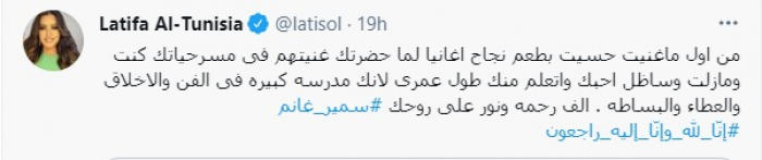 وكتبت لطيفة، عبر حسابها على تويتر: "من أول ما غنيت حسيت بطعم نجاح أغانيا لما حضرتك غنيتهم في مسرحياتك.. كنت ومازلت وسأظل أحبك وأتعلم منك طول عمري، لأنك مدرسة كبيرة في الفن والأخلاق والعطاء والبساطة.. ألف رحمة ونور على روحك ، سمير غانم .. إنّا لله وإنّا إليه راجعون".