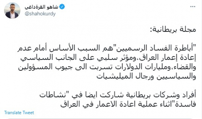 وقال في تغريدة عبر "تويتر" رصدها "المشهد العربي": "مجلة بريطانية: أباطرة الفساد الرسميين هم السبب الأساس أمام عدم إعادة إعمار العراق،ومؤثر سلبي على الجانب السياسي والقضاء، ومليارات الدولارات تسربت الى جيوب المسؤولين والسياسيين ورجال المليشيات".