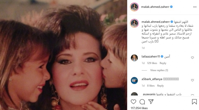 وكتبت ملك، عبر حسابها على إنستجرام: "اللهم أشفها شفاء لا يغادره سقما ورجعها يا رب لبناتها وعائلتها والناس اللي بتحبها وبتموت فيها، وأرحم الأستاذ سمير غانم وأغفر له وأسكنه فسيح جناتك وصبر أهله وصبرنا جميعا يا رب.. آمين".