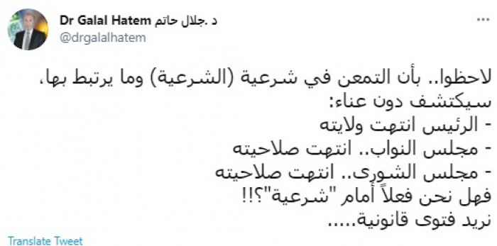 وأضاف: "فهل نحن فعلًا أمام شرعية.. نريد فتوى قانونية".