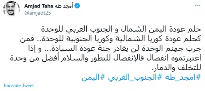 وقال في تغريدة عبر "تويتر" رصدها "المشهد العربي": "حلم عودة اليمن (الشمال) والجنوب العربي للوحدة كحلم عودة كوريا الشمالية وكوريا الجنوبية للوحدة"