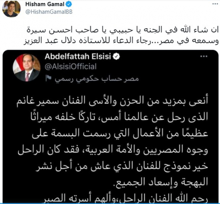 وكتب جمال، عبر حسابه على تويتر: "إن شاء الله في الجنة يا حبيبي يا صاحب أحسن سيرة وسمعة في مصر .. رجاء الدعاء للأستاذة دلال عبد العزيز".