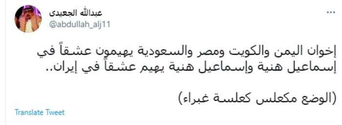 وقال في تغريدة عبر "تويتر" رصدها "المشهد العربي": "إخوان اليمن والكويت ومصر والسعودية يهيمون عشقًا في إسماعيل هنية وإسماعيل هنية يهيم عشقًا في إيران".