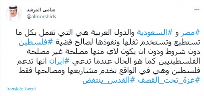 وقال في تغريدة عبر "تويتر" رصدها "المشهد العربي": "مصر والسعودية والدول العربية هي التي تعمل بكل ما تستطيع وتستخدم ثقلها ونفوذها لصالح قضية فلسطين دون شروط ودون أن يكون لأي منهما مصلحة غير مصلحة الفلسطينيين".