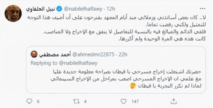 وجه أحد متابعي الحلفاوي، سؤالا له عبر تويتر، قال فيه: "حضرتك اشتغلت إخراج مسرحي يا قبطان بصراحة معلومة جديدة عليا.. مع علمي إن الإخراج المسرحي أصعب بمراحل من الإخراج السينمائي.. لماذا لم تكرر التجربة يا قبطان؟ ".