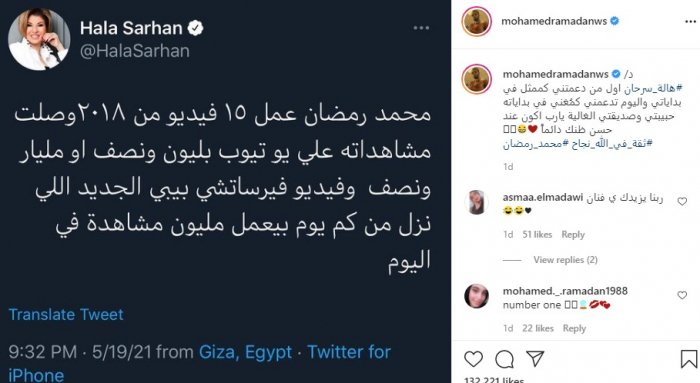 ونشر رمضان، تعليق لهالة سرحان يخصه، عبر حسابه على إنستجرام، وعلق : "د/ هالة سرحان.. أول من دعمتني كممثل في بداياتي واليوم تدعمني كمُغني في بداياتي.. حبيبتي وصديقتي الغالية يارب أكون عند حسن ظنك دائماً".