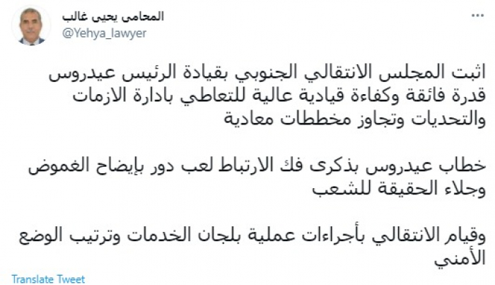 وقال في تغريدة عبر "تويتر" رصدها "المشهد العربي": "أثبت المجلس الانتقالي الجنوبي بقيادة الرئيس عيدروس قدرة فائقة وكفاءة قيادية عالية للتعاطي بإدارة الأزمات والتحديات وتجاوز مخططات معادية".