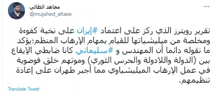 وقال في تغريدة عبر "تويتر" رصدها "المشهد العربي": "تقرير رويترز الذي ركز على اعتماد إيران على نخبة كفوءة ومخلصة من ميليشياتها للقيام بمهام الإرهاب المنظم؛يؤكد ما نقوله دائما أن المهندس و سليماني كانا ضابطي الإيقاع بين (الدولة واللادولة والحرس الثوري)".