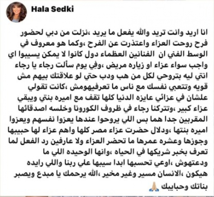 وكتبت هالة، عبر حسابها على "فيسبوك" تعليقا على صورة تجمع رجاء الجداوي ودلال عبدالعزيز: "أنا أريد وأنت تريد والله يفعل ما يريد.. نزلت من دبي لحضور فرح، روحت العزاء، واعتذرت عن الفرح".