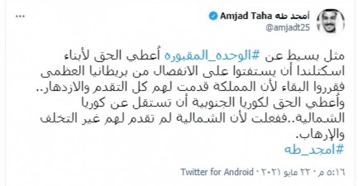 وكتب "طه" تغريدة عبر تويتر، رصدها "المشهد العربي": "مثل بسيط عن #الوحدة _ المقبورة، أعطي الحق لأبناء اسكتلندا أن يستفتوا على الانفصال من بريطانيا العظمى فقرروا البقاء لأن المملكة قدمت لهم كل التقدم والازدهار".
