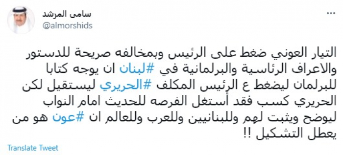 وكتب في تغريدة عبر "تويتر" رصدها "المشهد العربي": "التيار العوني ضغط على الرئيس وبمخالفة صريحة للدستور والأعراف الرئاسية والبرلمانية في لبنان أن يوجه كتابا للبرلمان ليضغط على الرئيس المكلف الحريري ليستقيل لكن الحريري كسب فقد استغل الفرصه للحديث أمام النواب ليوضح ويثبت لهم وللبنانيين وللعرب وللعالم أن عون هو من يعطل التشكيل".