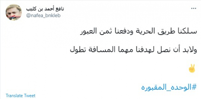 وكتب في تغريدة عبر "تويتر" رصدها "المشهد العربي": "سلكنا طريق الحرية ودفعنا ثمن العبور ولا بد أن نصل لهدفنا مهما المسافة تطول".