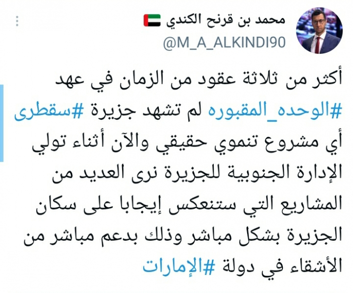 ولفت في تغريدة على حسابه بموقع التدوين المصغر تويتر، اليوم إلى أن: "أكثر من ثلاثة عقود من الزمان في عهد الوحدة المقبورة لم تشهد جزيرة سقطرى أي مشروع تنموي حقيقي".