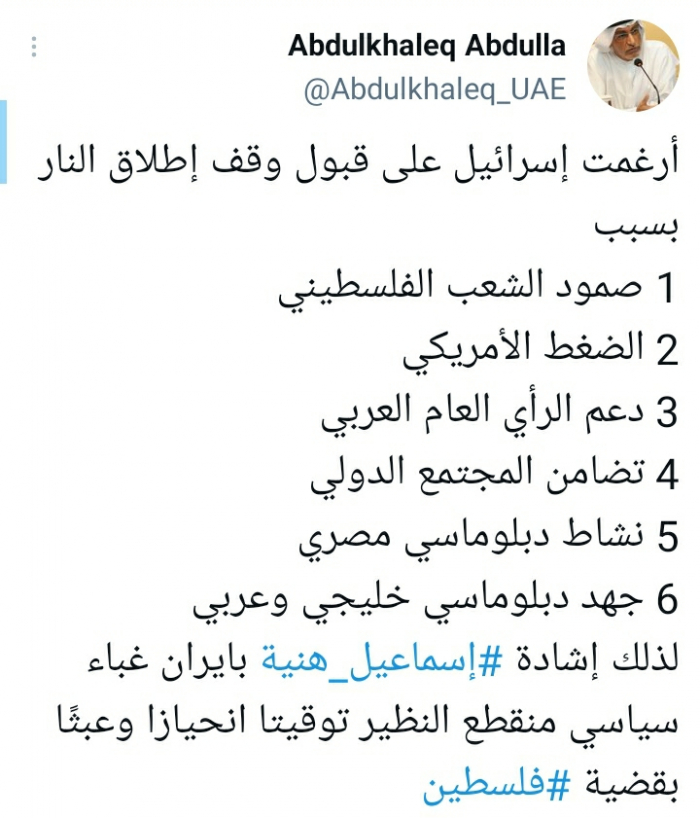 وشدد في تغريدة على حسابه بموقع التدوين المصغر تويتر، اليوم على أنه: "أرغمت إسرائيل على قبول وقف إطلاق النار بسبب صمود الشعب الفلسطيني والضغط الأمريكي ودعم الرأي العام العربي وتضامن المجتمع الدولي".