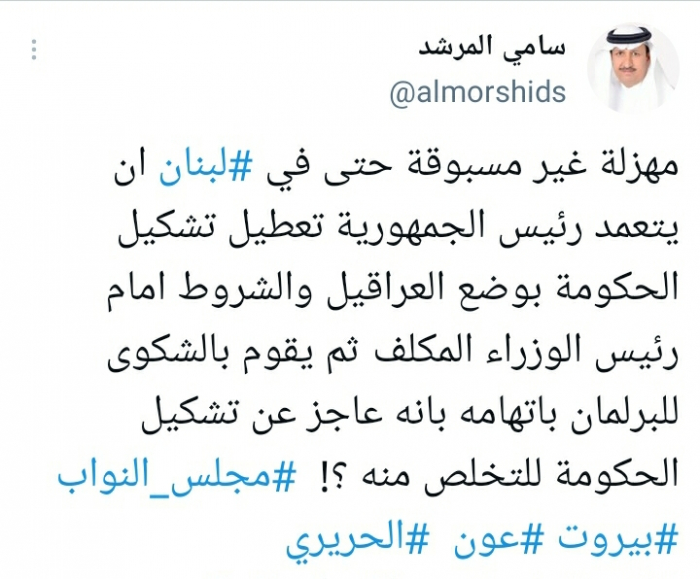 وشدد في تغريدة على حسابه بموقع التدوين المصغر تويتر، اليوم على أنها: "مهزلة غير مسبوقة حتى في لبنان أن يتعمد رئيس الجمهورية تعطيل تشكيل الحكومة بوضع العراقيل والشروط أمام رئيس الوزراء المكلف".