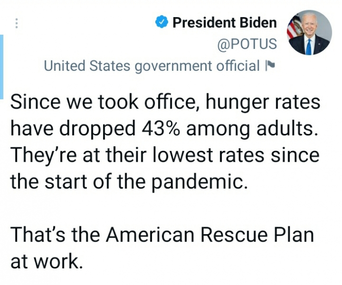 أعلن الرئيس الأمريكي جو بايدن، تراجع معدلات الجوع بين البالغين، إلى أدنى مستوياتها منذ تفشي فيروس كورونا.