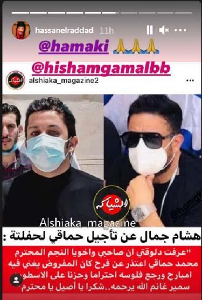 ونشر "الرداد" صورتين، على خاصية "القصص القصيرة"، عبر حسابه الرسمي بموقع "إنستجرام" يشكر بهما حماقي وهالة صدقي.