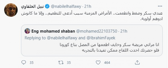 جاء ذلك ردا منه على سؤال لأحد متابعيه عبر تويتر، قال له: "أنا مراتي مريضة سكر وخايف أطعمها من المصل بتاع كورونا، فلو حضرتك أخدت اللقاح ممكن تفيدنا بالتجربة".