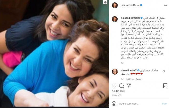 ونشرت هالة، صورة لدلال مع ابنتيها دنيا وإيمي سمير غانم، وعلّقت: "بشكر كل الأقلام التي أشادت بتصرفي في اعتذاري عن حضوري عدة مناسبات بالقاهرة لأصدقاء لي، إلا أننا تركنا القضية الحقيقية وهو فقدان نجم كبير أسعدنا جميعا، أرجو منكم التركيز فقط على الدعاء لدلال عبد العزيز لتعود لبناتها وبيتها وندعو لها أن تتحمل صدمة فقدان شريك وحبيب العمر".