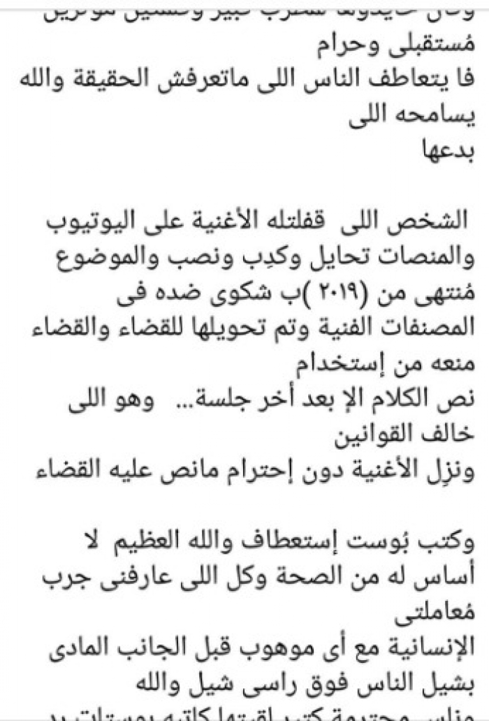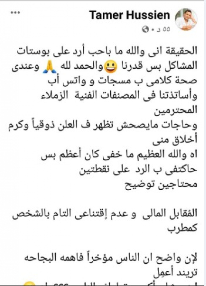 ومن جهته رد الشاعر تامر حسين عبر صفحته في موقع فيسبوك، وعلق: "الشخص اللي قفلت له الأغنية على اليوتيوب والمنصات، تحايل وكدِب ونصب والموضوع مُنتهي من (2019)، بشكوى ضده في المصنفات الفنية وتم تحويلها للقضاء والقضاء منعه من استخدام نص الكلام إلا بعد آخر جلسة، وهو اللي خالف القوانين، ونزِل الأغنية دون احترام ما نص عليه القضاء، وكتب بُوست استعطاف، والله العظيم لا أساس له من الصحة وكل اللي عارفني جرب مُعاملتي الإنسانية مع أي موهوب قبل الجانب المادي".