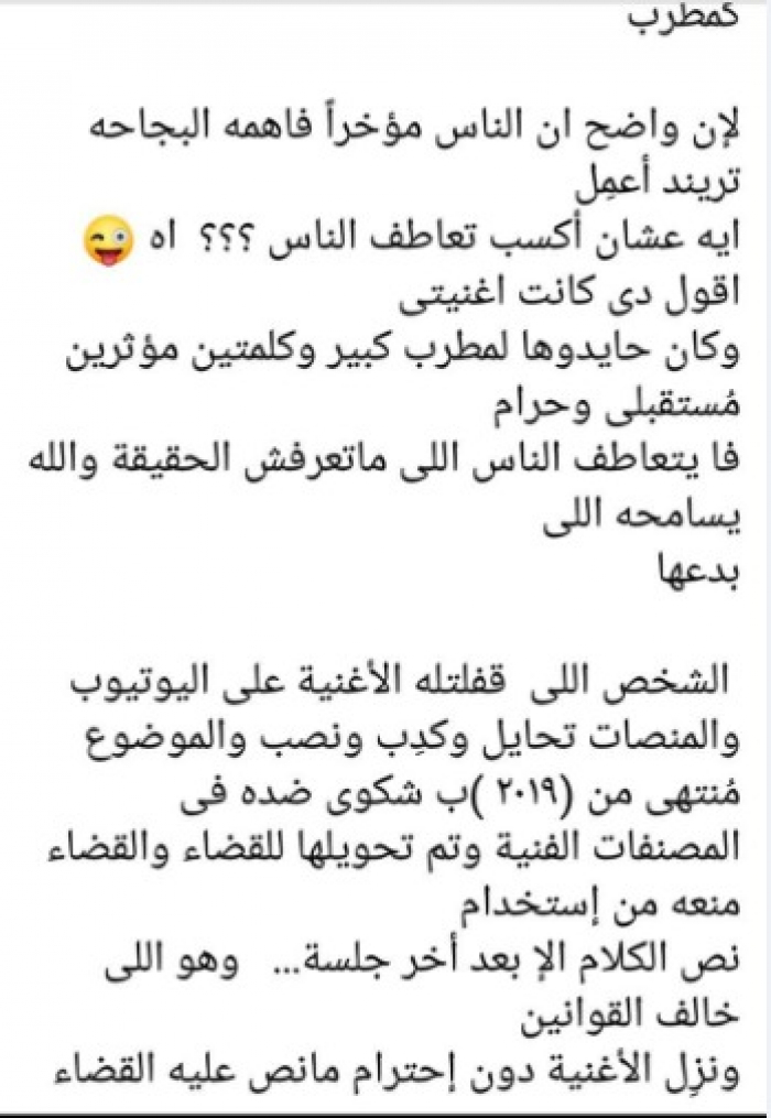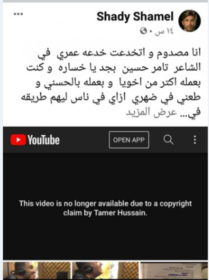 وأضاف: "تامر شال أغنيتي يا معود قلبي إمبارح من اليوتيوب، معرفش عمل كده إزاي، بعد ما كانت داخلة على نص مليون view في أقل من ٢٤ ساعة، وبيدعي اني ما اديتهوش فلوس الأغنيه، مع إنه عاملي تنازل من سنتين في المصنفات الفنية ومختوم بختم الجمهورية وواخد أجره المادي الكامل باعتراف منه، ومعترف بذلك في التنازل، وقالي بعد ما عمل التنازل الأغنية ملكك يا شادي انت تعبت وتستاهل".