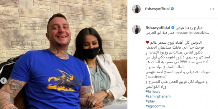 ونشر "الفيشاوي" صورًا من العرض تجمعه بزوجته ووزيرة الثقافة الدكتورة إيناس عبد الدايم، عبر حسابه الرسمي بموقع "إنستجرام"، وعلق: "إمبارح روحنا عرض مسرحية أبو العربي، العرض كان إهداء لروح سمير غانم".