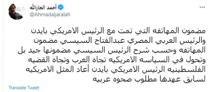 وقال في تغريدة عبر "تويتر" رصدها "المشهد العربي": "مضمون المهاتفة التي تمت مع الرئيس الأمريكي بايدن والرئيس العربي المصري عبدالفتاح السيسي مضمون المهاتفة وحسب شرح الرئيس السيسي مضمونها جيد بل وتحول في السياسه الأمريكية تجاه العرب وتجاه القضية الفلسطينية".