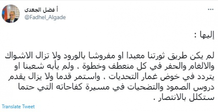 وكتب في تغريدة عبر "تويتر" رصدها "المشهد العربي": "لم يكن طريق ثورتنا معبدا أو مفروشا بالورود ولا تزال الأشواك والألغام والحفر في كل منعطف وخطوة ، ولم يأبه شعبنا أو يتردد في خوض غمار التحديات ".
